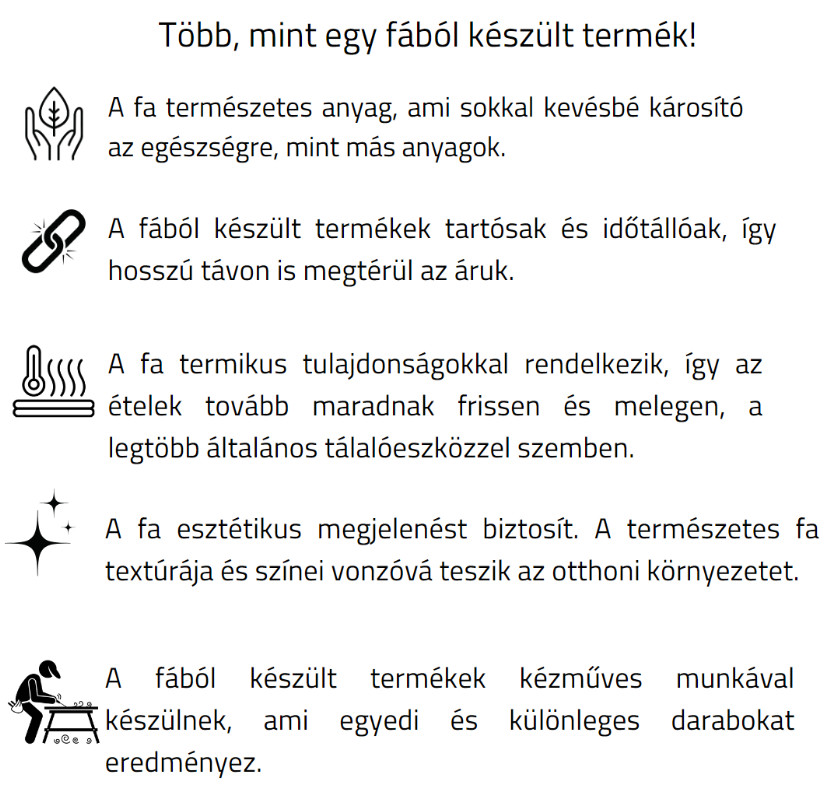 Ideális megoldás vendégek fogadására, legyen szó baráti buliról, családi összejövetelről vagy izgalmas meccsnézésről. A természetes faanyag hangulatossá és meleggé varázsolja a terítéket, miközben strapabíró és hosszú élettartamú. Egy igazán praktikus kiegészítő, amely feldobja minden közös alkalmat.